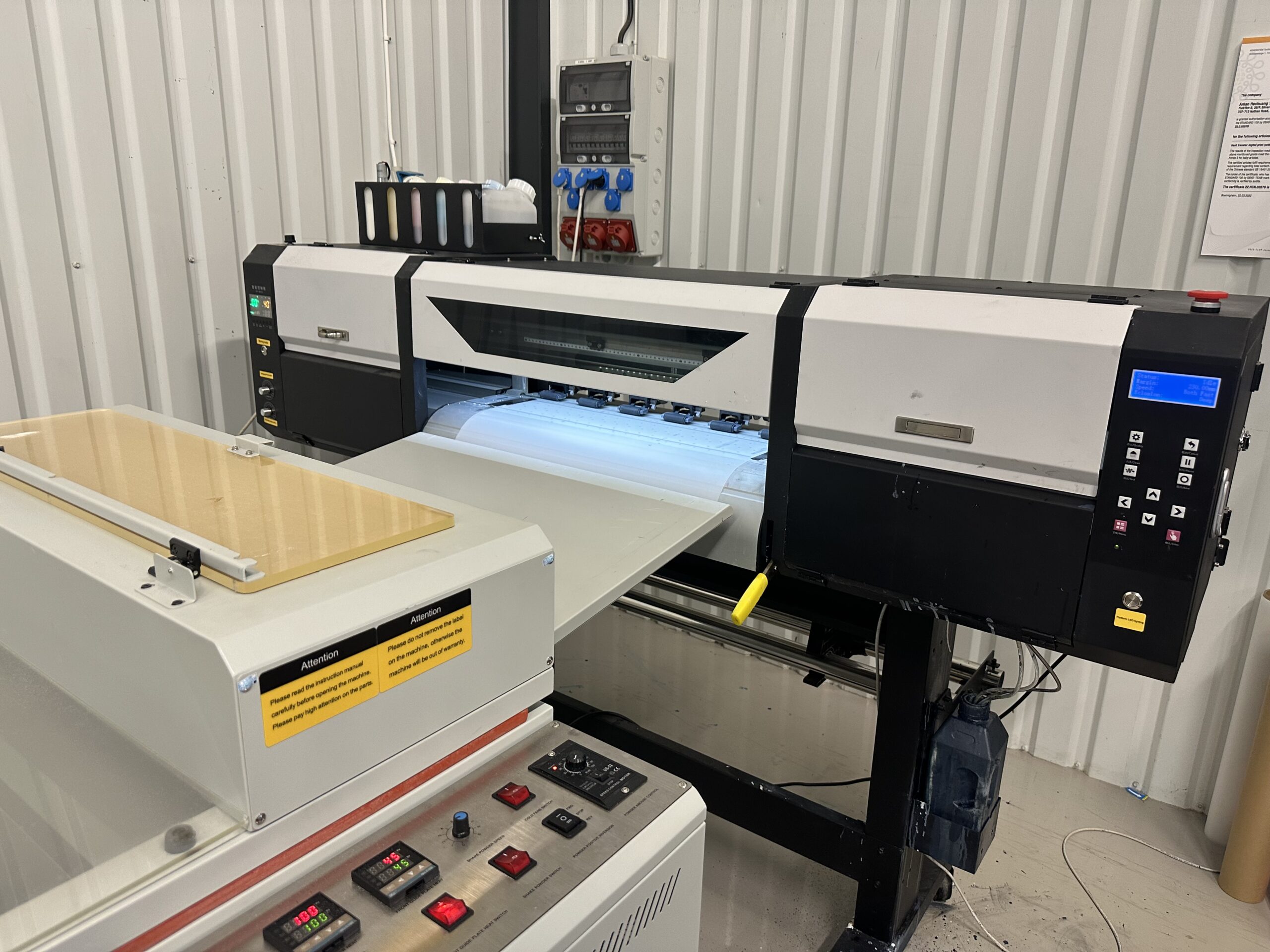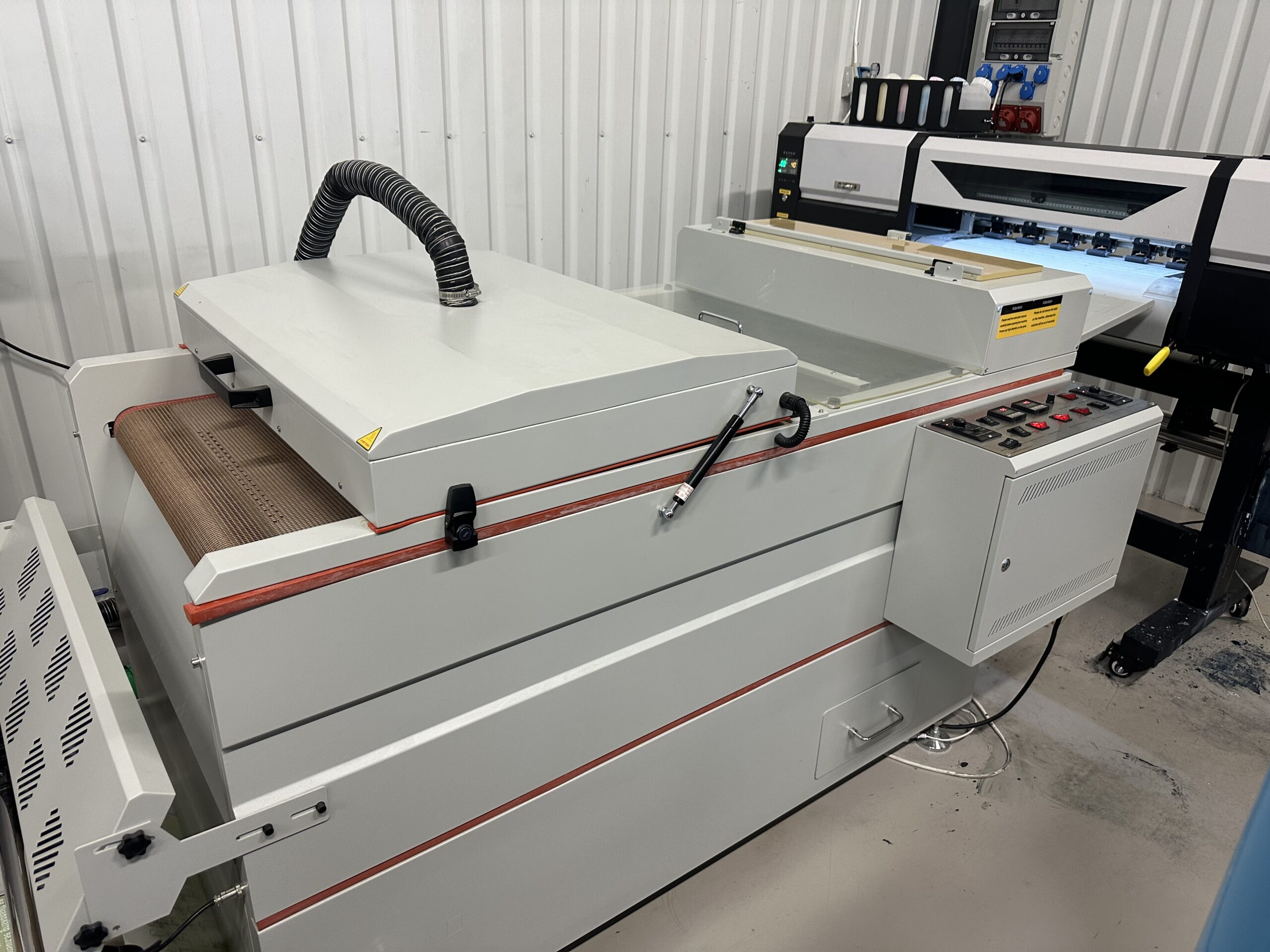 Begagnad DTF-printer från märket RS Pro Transfer som servats kontinuerligt med printhuvud för vitt i nyskick och printhuvud för CMYK med vissa saknade nozzlar för cyan.